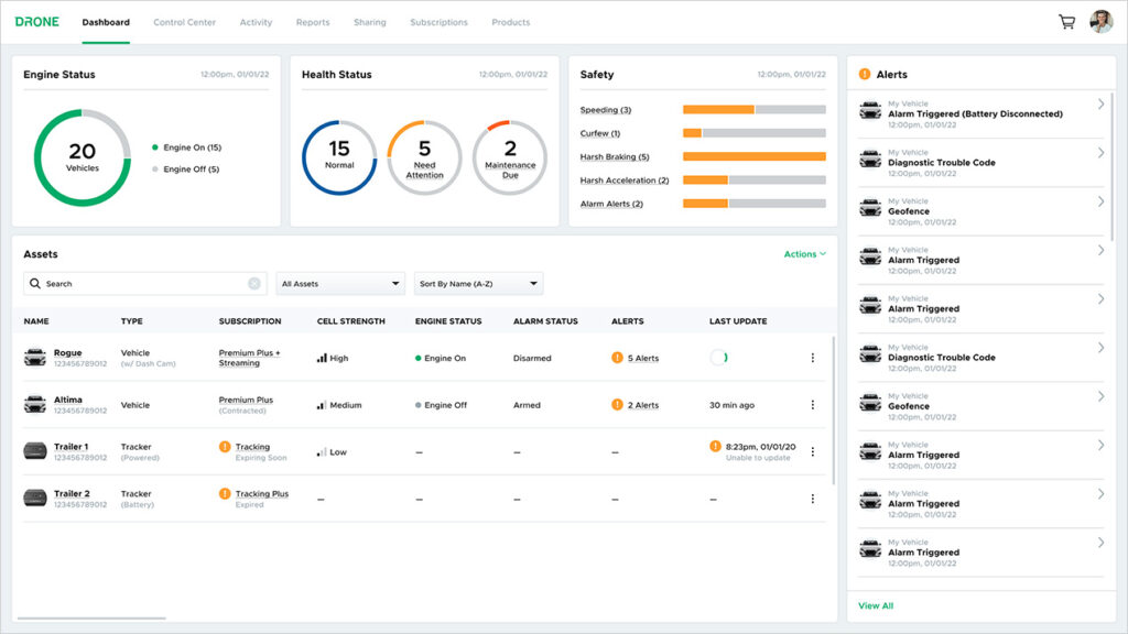 Your new Dashboard is the first thing you see when you log into the DroneMobile web app. It now provides a clean, at-a-glance snapshot of your entire fleet's status and recent alerts, so you know instantly if every vehicle is secure and where it should be.